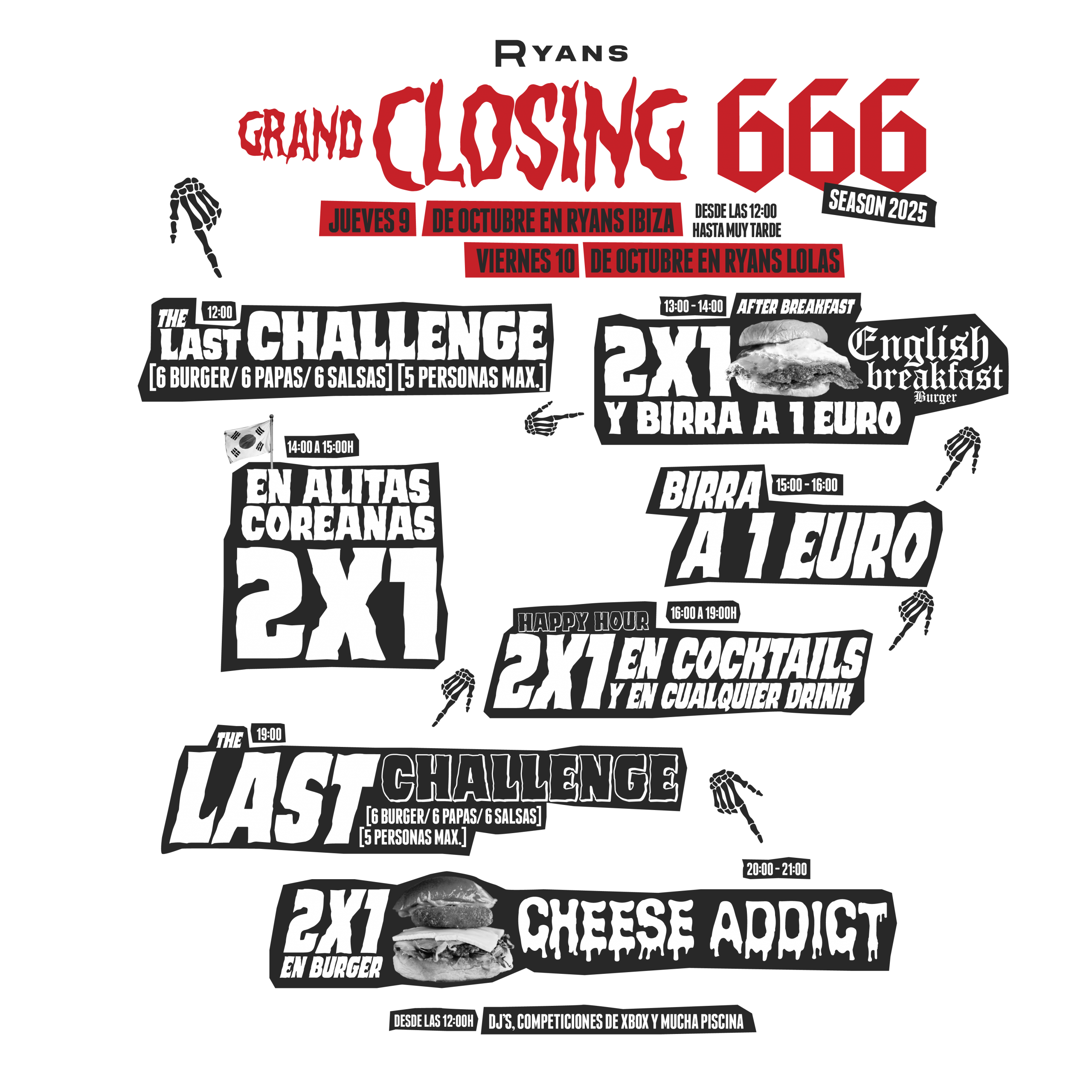 El final de la temporada 2025 llega a lo grande con el Grand Closing 666, una fiesta de dos días cargada de retos, promociones y diversión. El evento se celebrará el jueves 9 de octubre en Ryans Ibiza y el viernes 10 de octubre en Ryans Lolas.