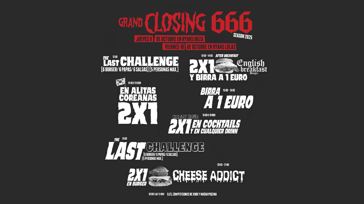 El final de la temporada 2025 llega a lo grande con el Grand Closing 666 , una fiesta de dos días cargada de retos, promociones y diversión. El evento se celebrará el jueves 9 de octubre en Ryans Ibiza y el viernes 10 de octubre en Ryans Lolas.